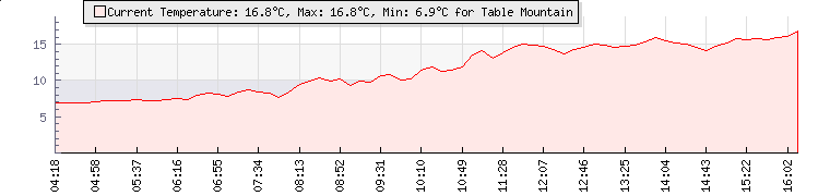 | GPS Co-ordinates: | S 33º 56' 54, E 18º 24' 10 | | ASL: | 3500 feet | | Sunrise / Sunset: | 05:29 / 19:51 | | Beaufort Scale: | Light Breeze |