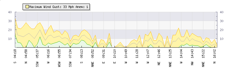 In the last few minutes the wind was Westerly at an average speed of 7 mph, reaching up to 12 mph and a low of 2 mph. The gust strength is10 mph above the minimum speed |