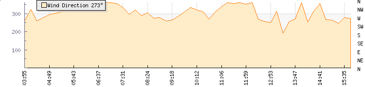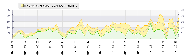 In the last few minutes the wind was North North West at an average speed of 6 kmh, reaching up to 9 kmh and a low of 4 kmh. The gust strength is5 kmh above the minimum speed |
