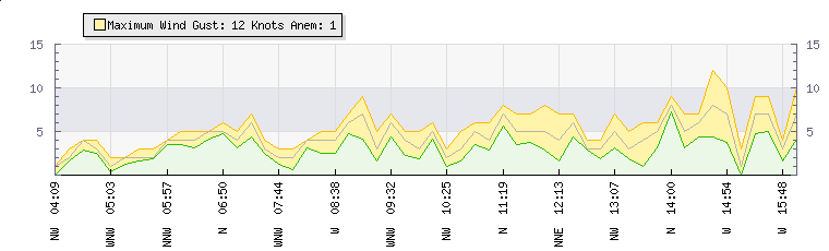 In the last few minutes the wind was North North West at an average speed of 3 knots, reaching up to 5 knots and a low of 2 knots. The gust strength is3 knots above the minimum speed |