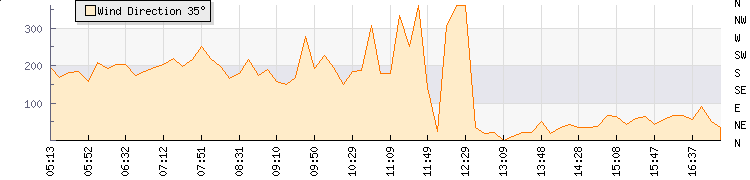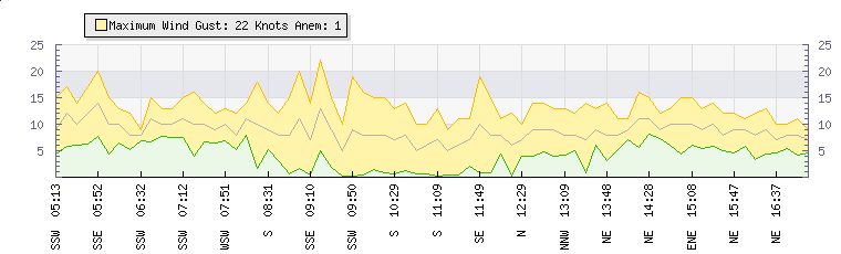In the last few minutes the wind was East North East at an average speed of 9 knots, reaching up to 11 knots and a low of 6 knots. The gust strength is5 knots above the minimum speed |