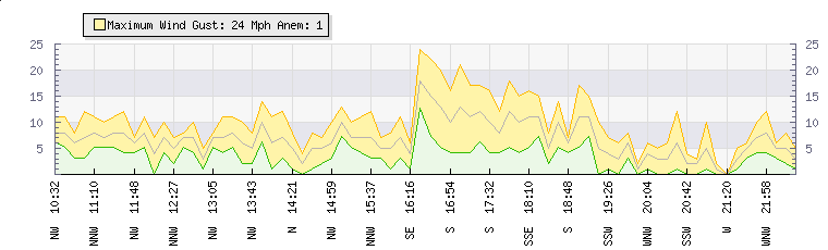 In the last few minutes the wind was South South West at an average speed of 5 mph, reaching up to 7 mph and a low of 2 mph. The gust strength is5 mph above the minimum speed |