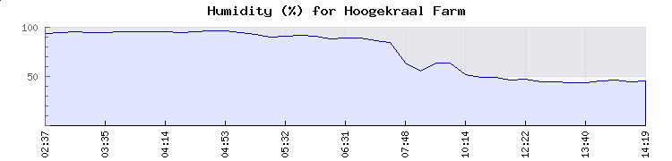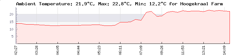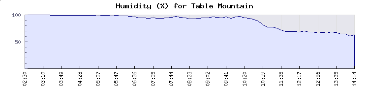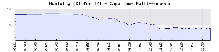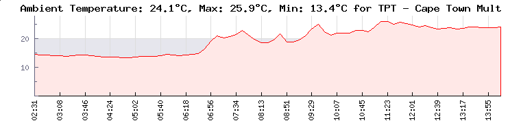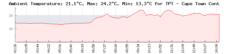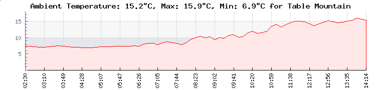 Minimum Temperatures: uMkhuze Game Reserve Airstrip: 1°C | Table Mountain: 6.9°C | Klipfontein New: 8.2°C | Farm Voorspoed: 8.3°C | Maximum Temperatures: Pumula Farm: 38.7°C | Meyer Pines Boerdery: 38.1°C | Wegro Ubizane: 37.8°C | Laborie: 37.5°C | ...